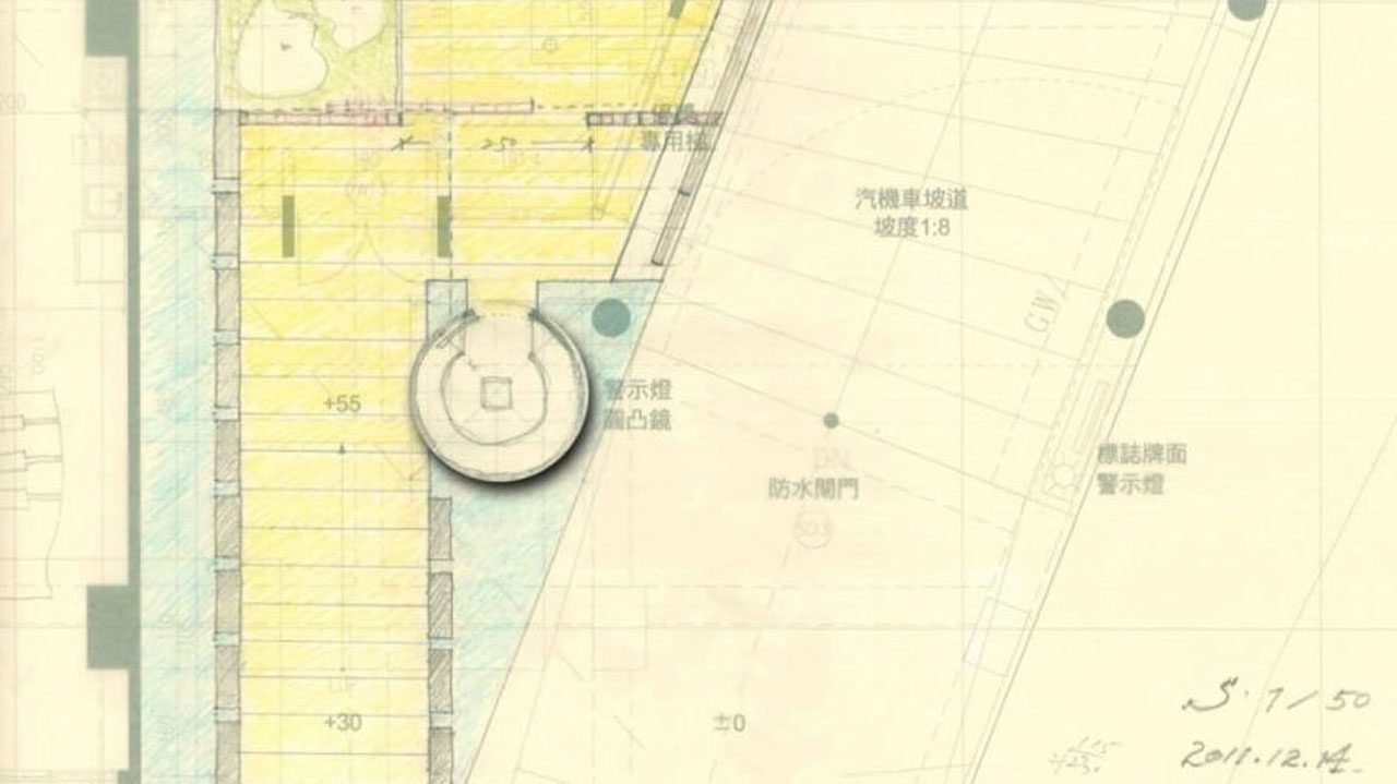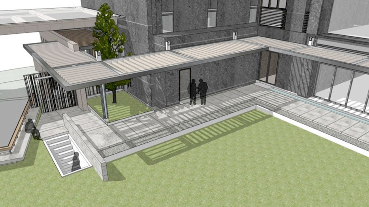 本案地面層入口中庭由三棟建築量體圍塑而成,提供居住者與景觀造景對話,周圍以迴廊圍繞,供給住戶供設之必要設施,使中庭成為住戶活動聚集的中心。