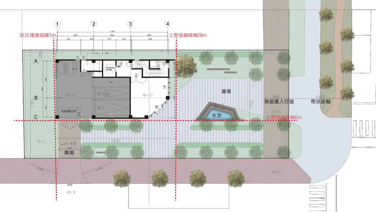 基地周圍現況已有公共人行道、公車站、超市等公共空間,景觀上兩側道路退縮,以接續現有開放空間及延伸友善環境為原則,設置水池及小型廣場,並延續鄰近植栽樹種及鋪面。
