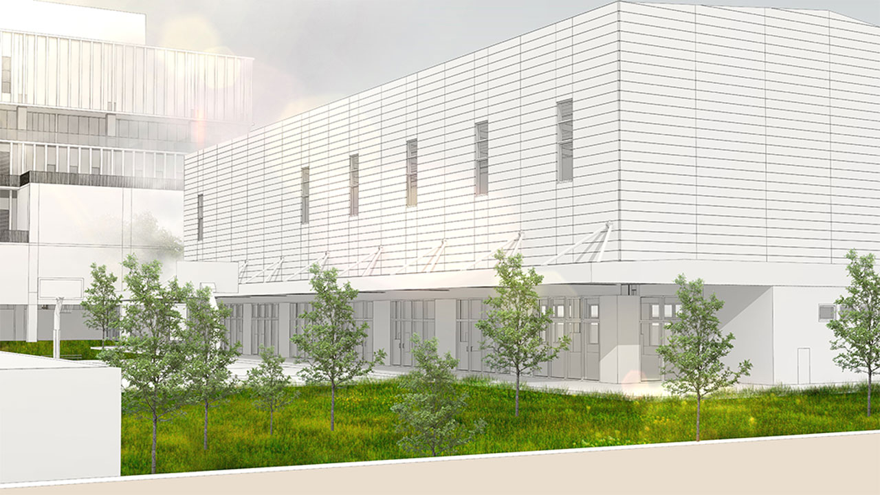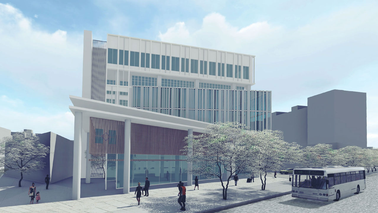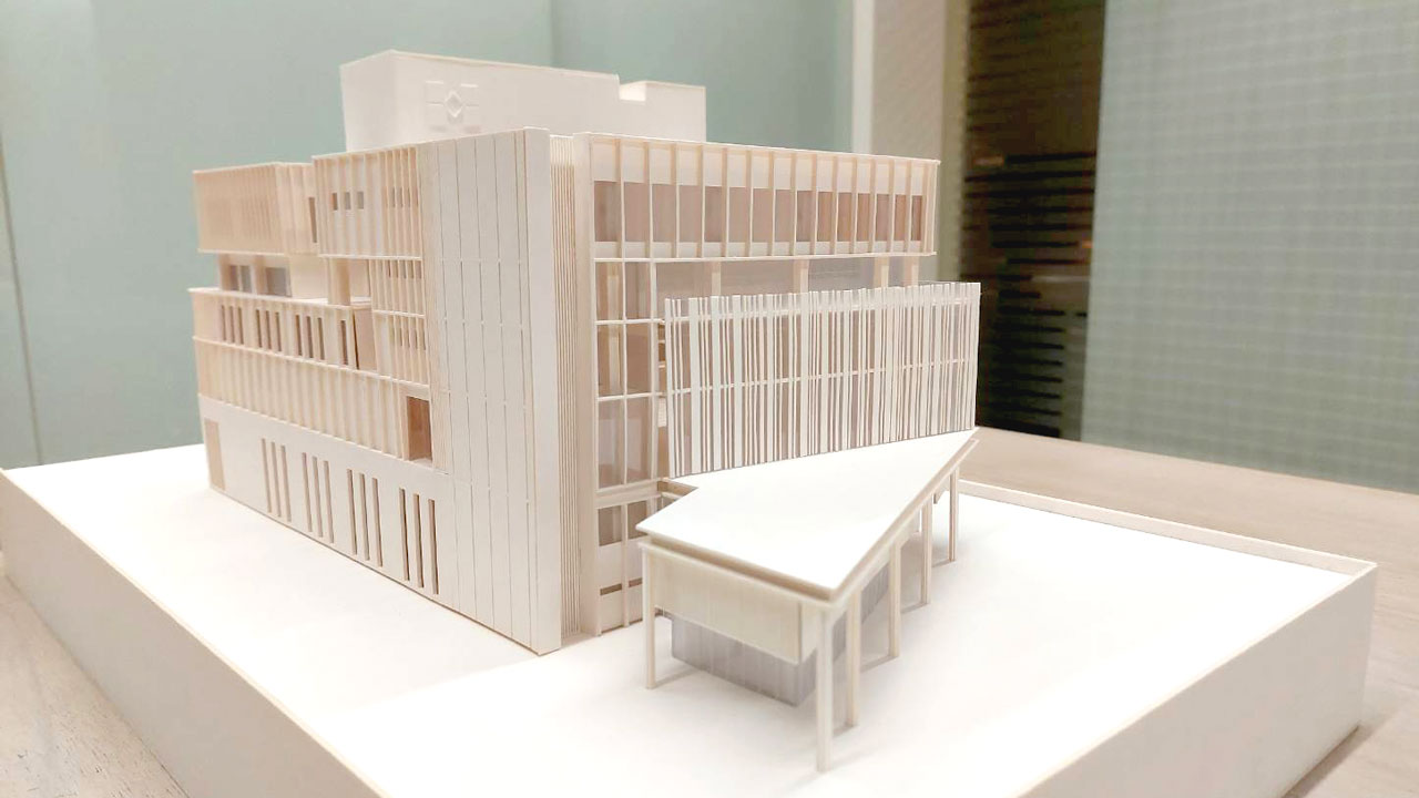 建築立面抽象化古典元素,擷取原總部方柱-圓柱-方柱的韻律作為主要牆面設計,延續傳承建築語彙,致敬當代銀行所樹立之沉穩、莊重氛圍。資訊部訊息表現,利用板信商銀官方網頁轉換之條碼形式做為格柵,呈現資訊部立面意象。同時,提出營業廳在地服務的想法,增加企業在地之可及性。