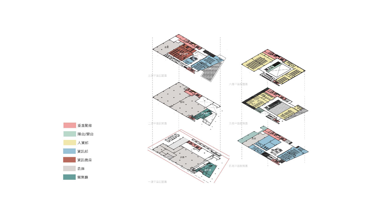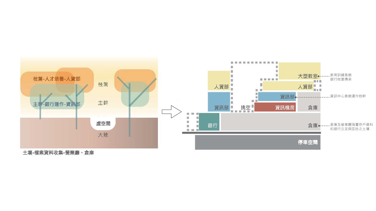 本案設計重點為整合營業廳、倉庫、資訊機房及教育訓練中心。從”物理環境”角度出發,營業廳配置於正前方緊鄰街道、對外開放,倉庫機房等高階重要內部資訊安排於低樓層及西南側以降低日曬(象徵為銀行立足與茁壯之土壤)。資訊機房設置於建築物三樓量體正中心,兼顧安全與減少耗能(銀行之枝幹)。辦公及教育訓練中心則放置在高樓層,配合室內中庭挑空綠化及自然採光通風有利員工交流及放鬆(銀行枝繁葉茂之傳承)。