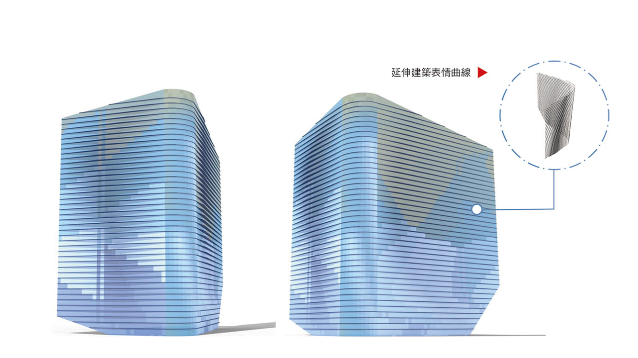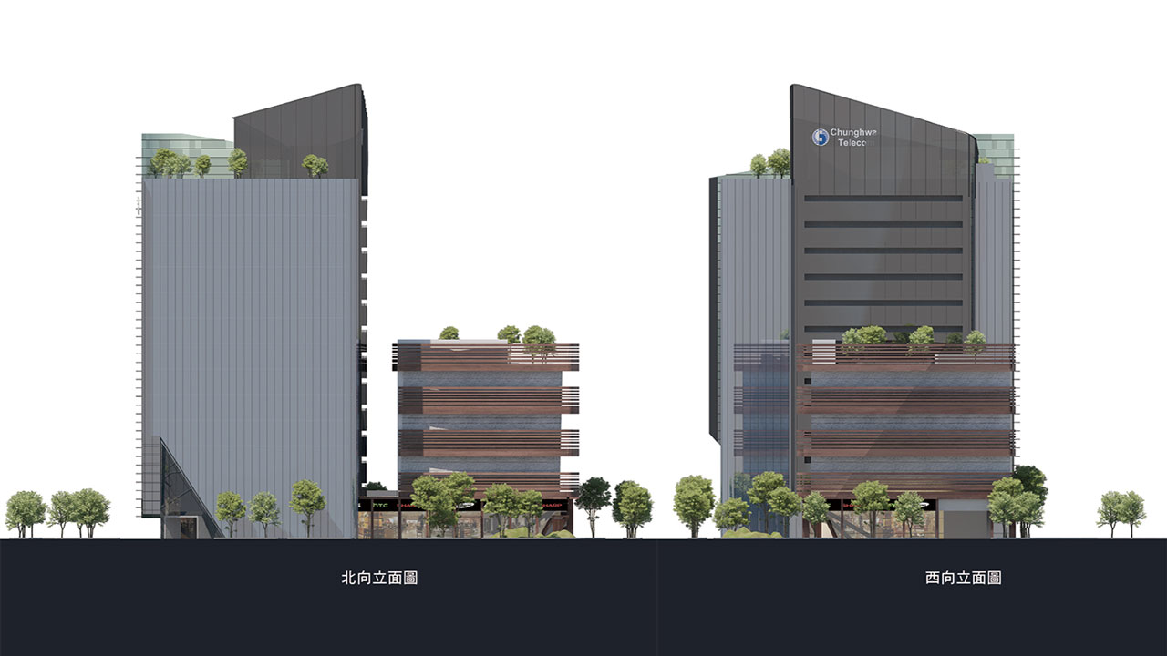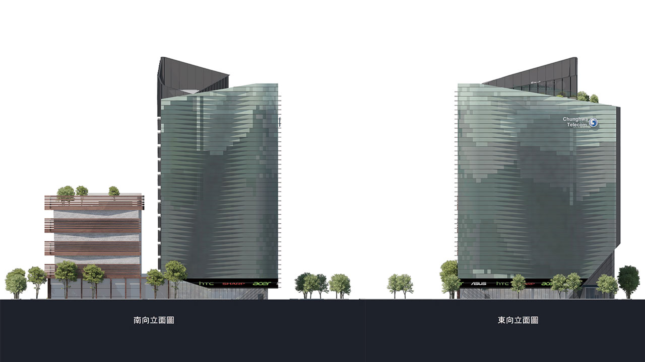 以玻璃帷幕為建材主體,應用了建築流動的曲線,轉換中華電信的企業形象及新媒體傳播意象,於建築表面呈現出新時代都會的流線感。並利用玻璃顏色的深淺,來反映日曬受熱的程度,有效阻隔日光熱能。以參數計算後之漸變水平遮陽板解決辦公棟東曬問題,同時創造具未來感之流線造型亦不阻隔落地玻璃視野。漸變遮陽板與數位變化深淺玻璃共同創造多變陰影,隨著日照角度及強弱的變換,創造出更多不同的細節及趣味。