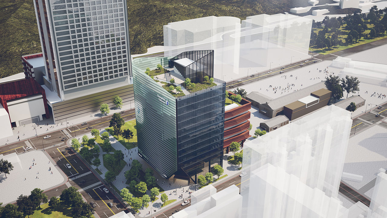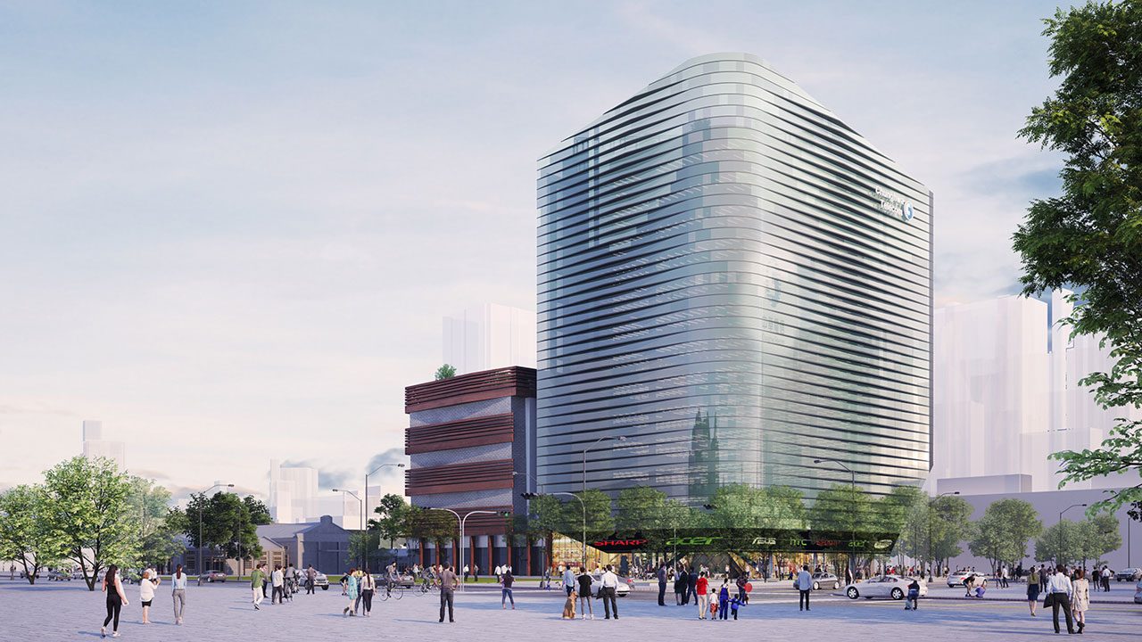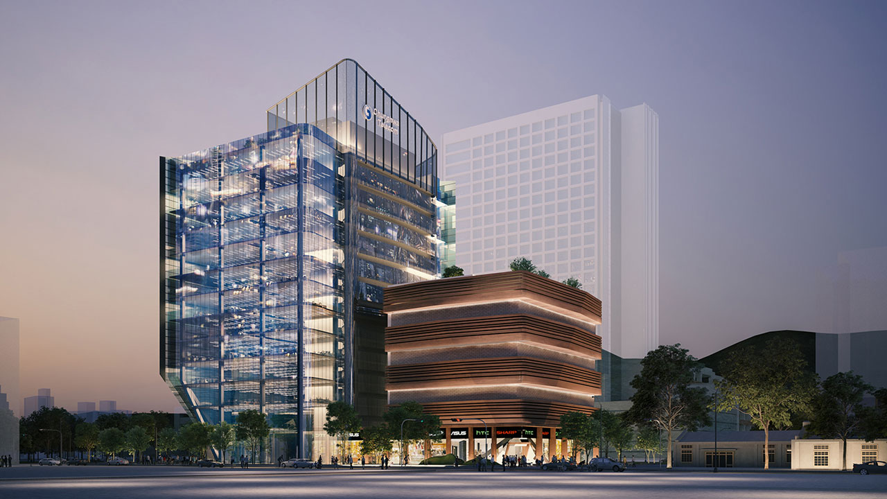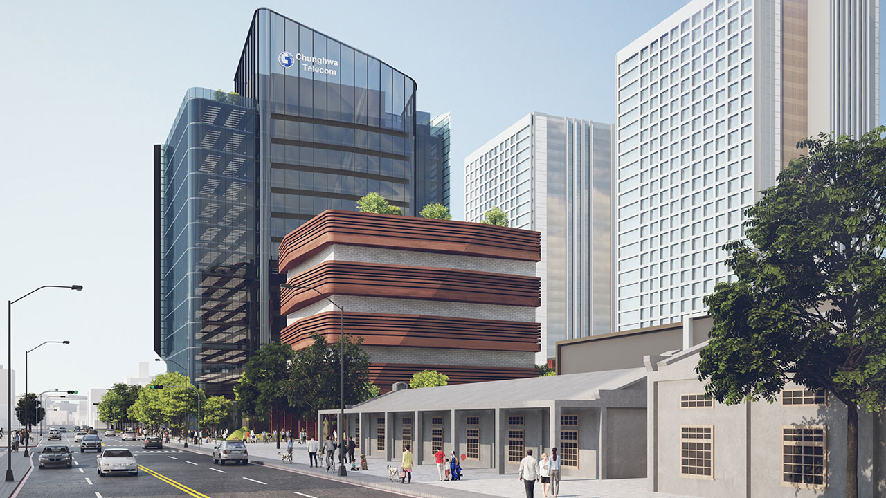 以玻璃帷幕為建材主體,應用了建築流動的曲線,轉換中華電信的企業形象及新媒體傳播意象,於建築表面呈現出新時代都會的流線感。並利用玻璃顏色的深淺,來反映日曬受熱的程度,有效阻隔日光熱能。以參數計算後之漸變水平遮陽板解決辦公棟東曬問題,同時創造具未來感之流線造型亦不阻隔落地玻璃視野。漸變遮陽板與數位變化深淺玻璃共同創造多變陰影,隨著日照角度及強弱的變換,創造出更多不同的細節及趣味。