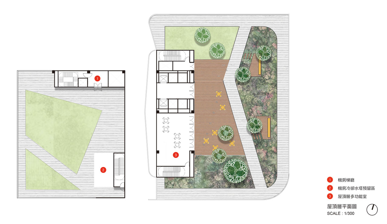 機房棟於地面層呼應瓶蓋工廠歷史建築,以”柱廊”建築型式整合商場及汽機車出入口,二層以上以金屬格柵與玻璃豐富層次打破過往機房建物封閉/ 厚重/ 呆板形象,更象徵回應瓶蓋工廠連結/ 對話/ 融和之初心。